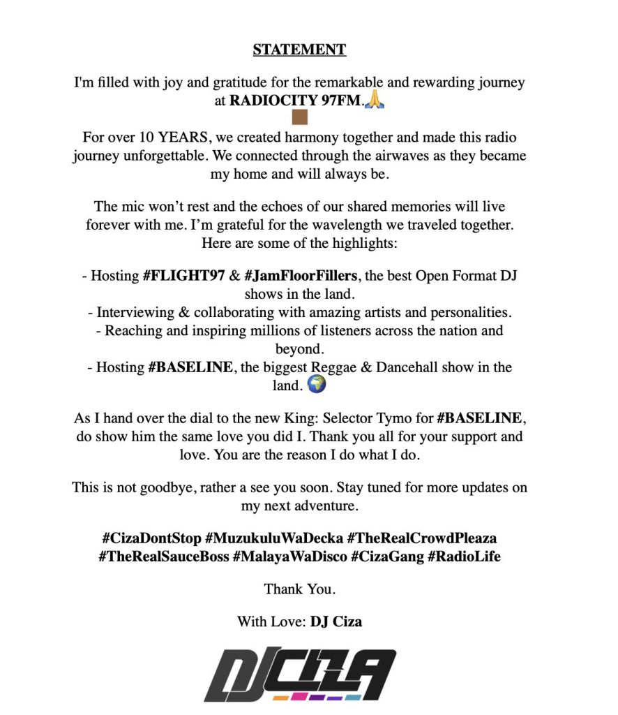 DJ Ciza’s departure marks the end of an era at Radio City 97FM, leaving behind a legacy of exceptional entertainment and unwavering dedication.